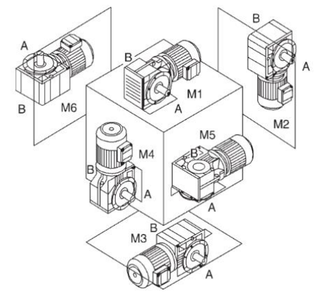 موتور نصب شده به صورت افقی M1، پایه واحد در پایین است. موتور M2 به صورت عمودی به سمت پایین نصب شده است. موتور نصب شده به صورت افقی M3، پایه واحد بالاست. موتور M4 به صورت عمودی به سمت بالا نصب شده است. موتور نصب شده به صورت افقی M5، اگر در موقعیت M1 قرار گیرد، سمت چپ واحد به سمت پایین می چرخد (نقطه دید: از سمت موتور). موتور نصب شده به صورت افقی M6، اگر در موقعیت M1 قرار گیرد، سمت چپ چرخش واحد به بالا (نقطه دید: از سمت موتور). | ![]() |