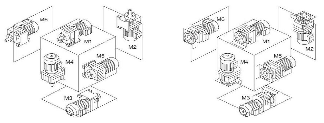 موتور نصب شده به صورت افقی M1، پایه واحد در پایین است. موتور M2 به صورت عمودی به سمت پایین نصب شده است. موتور نصب شده به صورت افقی M3، پایه واحد بالاست. موتور M4 به صورت عمودی به سمت بالا نصب شده است. موتور افقی نصب شده M5، اگر در موقعیت M1، سمت چپ قرار گیرد چرخش واحد به پایین (نقطه دید: از سمت موتور). موتور M6 نصب شده به صورت افقی، اگر در موقعیت M1 قرار گیرد، سمت چپ چرخش واحد به بالا (نقطه دید: از سمت موتور) | ![]() |